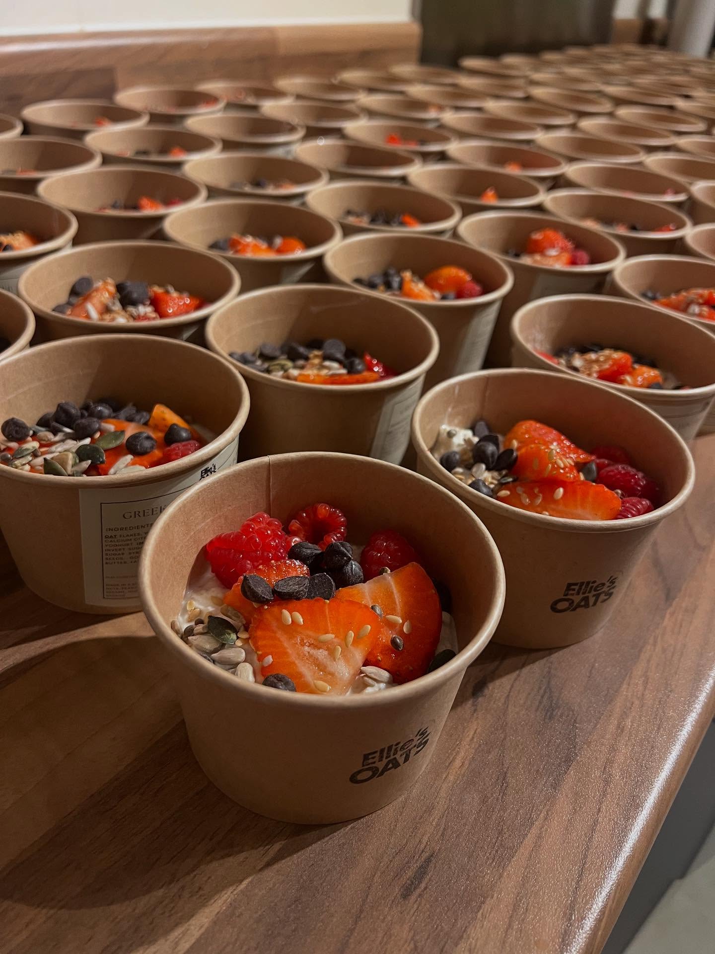 Oats soaked in chocolate oat milk & Greek yoghurt, mixed with nuts & dried fruit. Topped with extra fibre along with a drizzle of chocolate sauce.